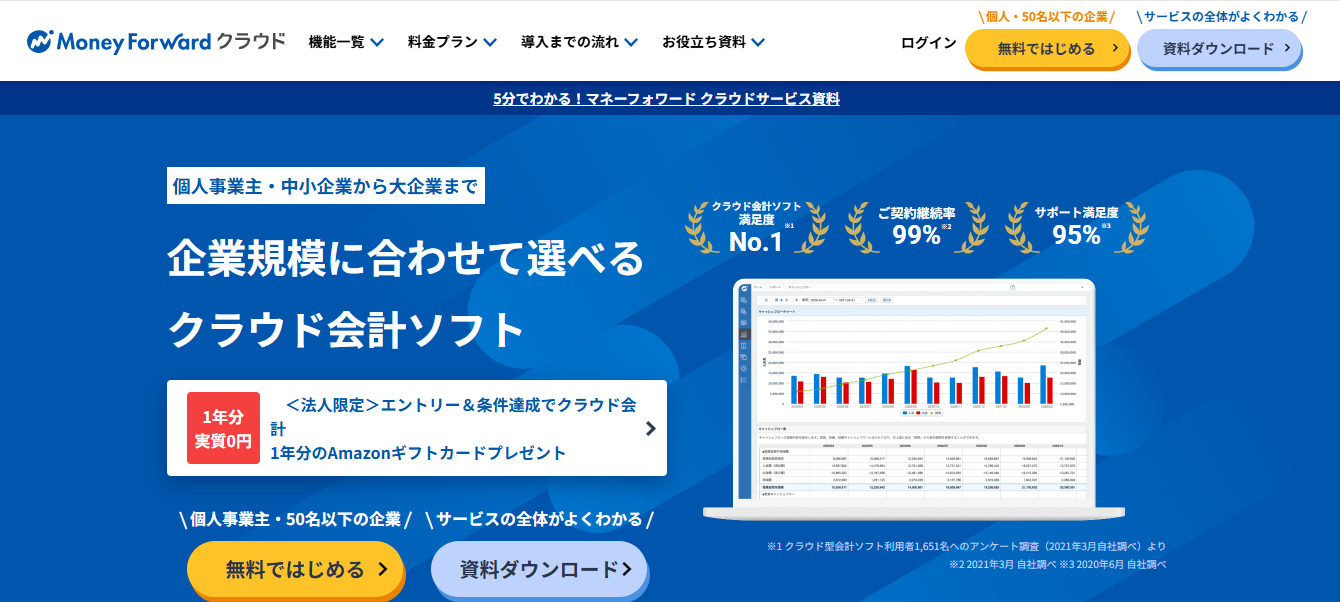 こちらは法人向けクラウド会計ソフトで、会計・経費・請求を誰でもカンタンにまとめて効率化できます。