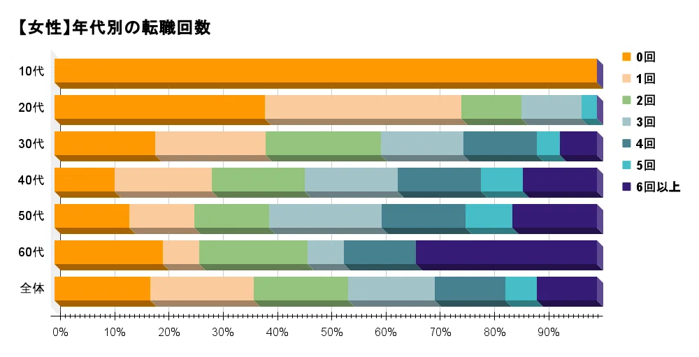全体の年代別で見ると、20代では半数以上の方が転職しています。