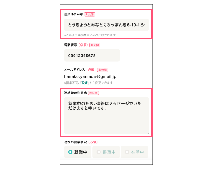 4・<連絡時の注意点>には、応募先からの連絡方法や希望の時間帯などを入力する