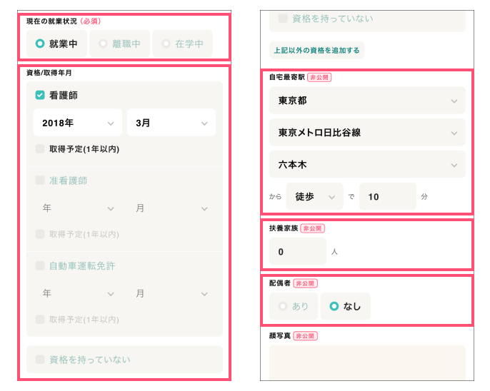 5・画面の表示に従って<現在の就業状況><資格/取得年月><自宅最寄駅><扶養家族><配偶者>を入力する