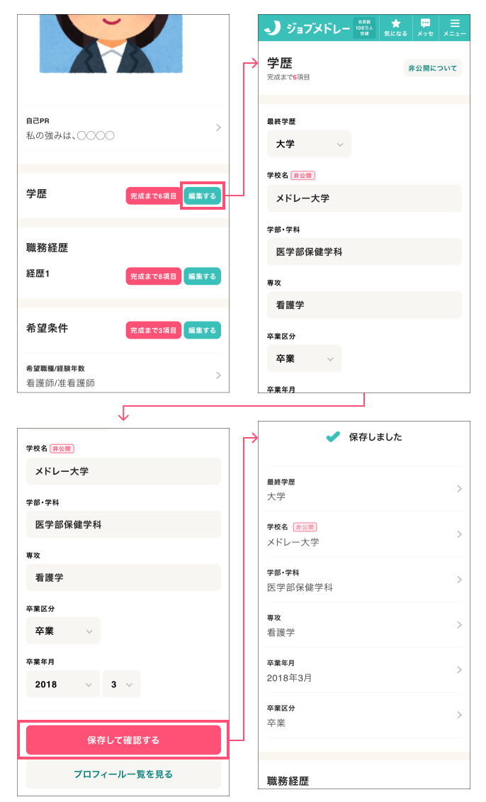 8・プロフィール画面を下にスクロールすると<学歴>の項目があるので、学歴の<編集する>ボタンを押して、最終学歴を入力し、<保存して確認する>ボタンを押す
