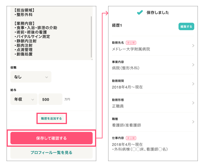 11・プロフィール画面を下にスクロールし、希望条件の<編集する>ボタンを押し、<希望職種/経験年数><希望勤務地><希望勤務形態><希望入職時期><希望年収>その他を入力し、<保存して確認する>ボタンを押す