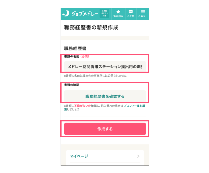 7・職務経歴書に名前をつけ、<職務経歴書を確認する><作成する>へと進む