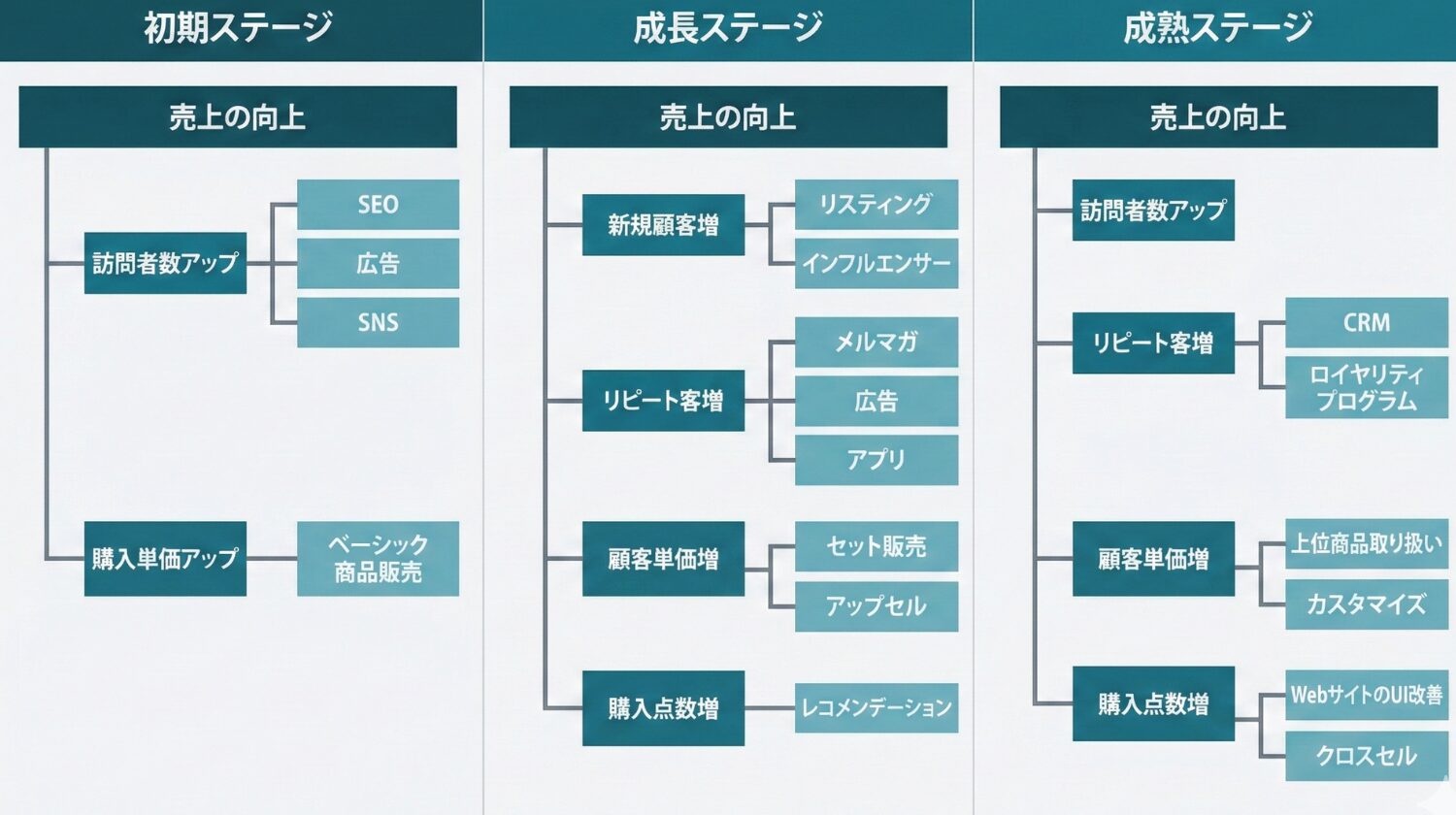 各ステージ毎にKPIツリーを設定し、数値を定期的に確認してみましょう。