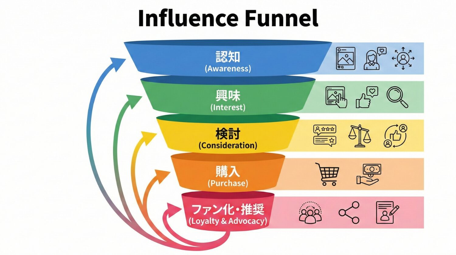 <インフルエンスファネル>は、顧客の購入後のアクションや心理を分析し、長期的なマーケティング戦略を構築する際に大いに役立ちます。