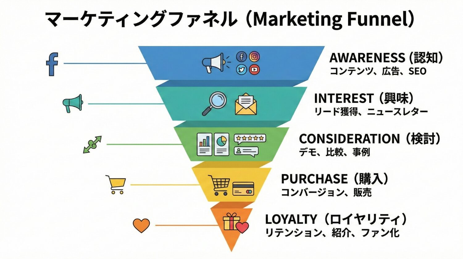 マーケティングファネルでは、顧客の製品やサービスに対する認知に始まり、購入に至るまでのステージを分析します。