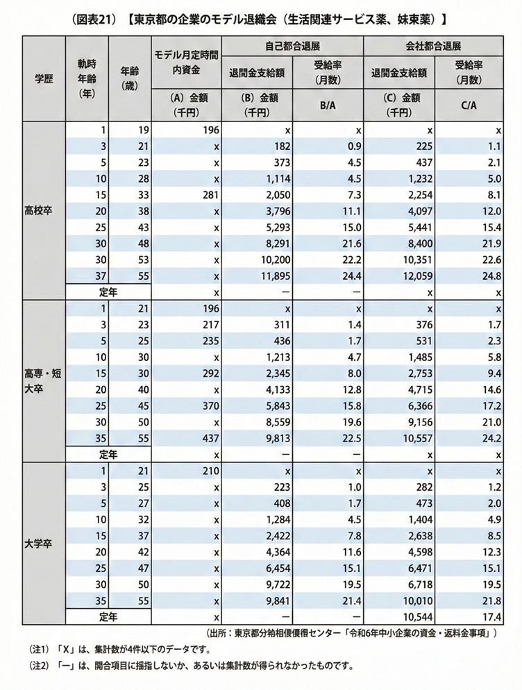 ここでは様々な産業の退職金データが公表されていますが、そのうちの1つが「(図表21)【東京都の企業のモデル退職金(生活関連サービス業、娯楽業)】」です。